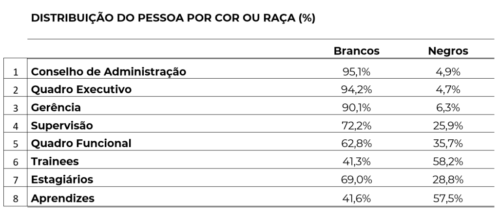 O relatório feito pelo Instituto Ethos, Perfil Social Racial e de Gênero das 500 maiores empresas do Brasil e suas ações afirmativas, explicita o afunilamento hierárquico que há no mercado de trabalho, que já acontece em posições anteriores a de estágio como demonstra o quadro abaixo.