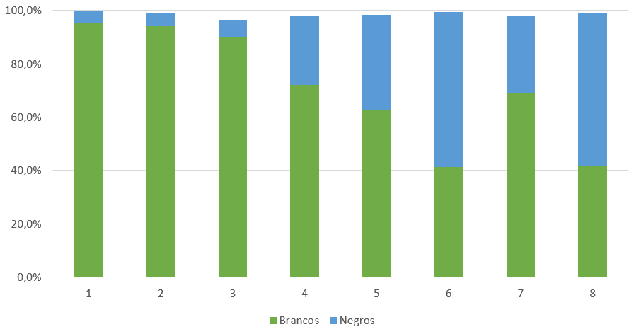 Analisando o Relatório Anual das Desigualdades Raciais no Brasil 2007-2008, pode-se observar a enorme discrepância entre os níveis de ocupação da população economicamente ativa (PEA) preta e branca. A PEA branca, tanto homens quanto mulheres, com ensino superior completo representavam em 1995 8,7% do mercado de trabalho, saltando para 13,5% em 2006, um aumento de 4,8%, já PEA negra com ensino superior em 1995 era constituída de 1,9%, em 2006 teve um singelo crescimento de 1,8%, indo para um total de 3,7% de negros com ensino superior no mercado de trabalho. Ou seja, embora a PEA negra tenha obtido crescimento na ocupação com ensino superior completo, ela apresenta um crescimento 2,6 vezes inferior a PEA branca no mesmo período, e seu índice total é ainda inferior a PEA branca no ano de 1995, logo podemos constatar que a PEA negra com graduação superior está, ao menos, onze anos atrasada em relação a PEA branca com a mesma escolaridade.